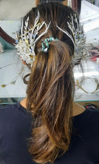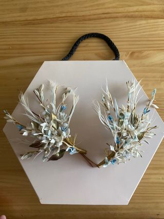 Tocado de novia hecho a mano. Piedras y plumas naturales, colores blanco, dorado y azul. Queda muy bonito puesto.