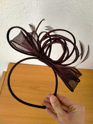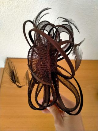 Tocado para el pelo para ceremonia. Se sujeta con una diadema. Color marrón. Detalles con plumas. En perfecto estado, usado una vez.