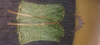 Preciosa pieza para completar tu disfraz. Se compone de un corsé de brocado verde con detalles dorados y un tocado a juego. El corsé tiene un cierre de cremallera y está decorado con lazos de raso. El tocado es una diadema con pedrería rosa. ¡Ideal para lucir espectacular!