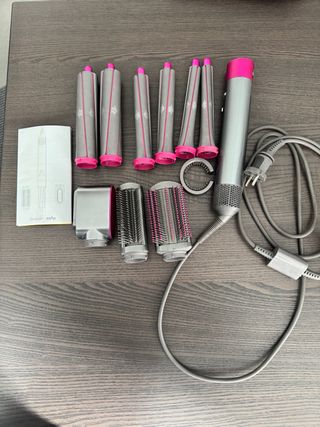 Set de accesorios Dyson Airwrap + un cepillo adicional - Incluye varios barriles y cepillos. - Viene con el manual de instrucciones. - Diseñado en color rosa y plateado. - Todos los accesorios originales La vendo porque hace un tiempo me regalaron la Dyson Airstrait y no he vuelto a tocar la airwrap, pero funciona perfectamente Estado: Funciona perfectamente, se ha usado poco. Tiene algunos imperfectos como rayones superficiales en el cuerpo del secador (visibles en las fotos) por el uso normal, pero no afectan el funcionamiento