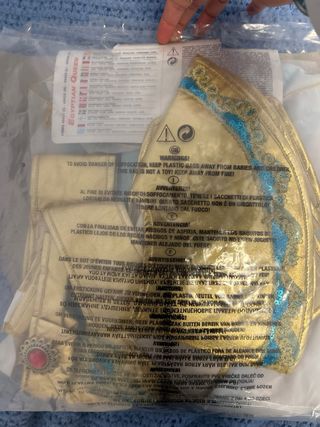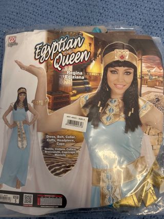 Completo disfraz de reina egipcia. - Incluye vestido, cinturón, collar, brazaletes, tocado y capa. - Diseño con detalles dorados y azules. - Talla S.