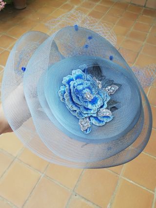 Tocado en colores azul celeste. Marca exclusiva Pablo y Mayaya. Precio original 300 euros. 25 cm de diámetro en zona máxima, sobre 22 el resto. Solo usado en una boda. Precio negociable, va con caja incluida