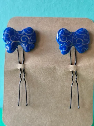 Set de dos horquillas decorativas con forma de lazo. - Hechas a mano con arcilla polimérica y bañadas con arcilla UV para un acabado brillante ( los lazos azules, las mariposas y los tulipanes ) Los tulipanes y las mariposas llevan el extra de unas pequeñas flores preservadas ( broom y paniculata mini) El precio marcado es por todo...los 5 sets!!!! También se venden sets sueltos...pregunta sin compromiso!!! Nuevos a estrenar!!!