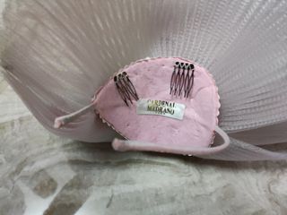 Elegante tocado de la marca Rosa y Carmen. - Diseño con velo. - Adornos florales. - Montado sobre diadema. -Hecho a mano