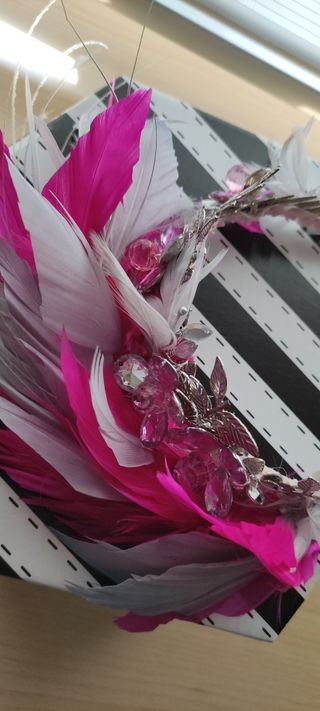 Precioso tocado o broche ideal para eventos especiales. - Está hecho de tul. - Incluye plumas. - Tiene pequeñas perlas decorativas. Hago envios