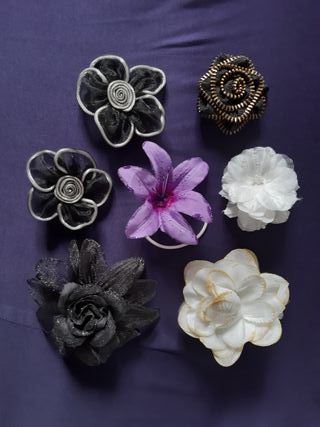 Conjunto de varios broches con forma de flor. Llevan cierre de pinza o tipo imperdible para fijarlas en la ropa, cinturón, bolso, colocarlas sobre el pelo... En las imágenes se ve bien el tipo de cierre que lleva cada flor. La flor morada lleva goma. Diseños variados y originales. Perfectos para adornar ropa o cabello. # flor tela negro blanco morado violeta bolso elegante vestido largo corto flores floral ropa prenda moda primavera comunión bautizo boda evento reunión recogido broche tocado