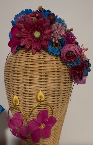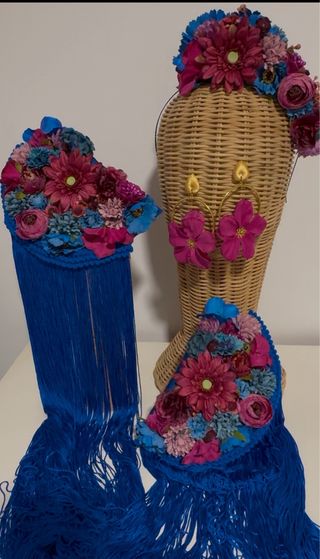 Conjunto de hombreras de flecos de 60 cms de largo en color azul eléctrico con flores en buganvilla, azules rosas y morado, se colocan con los imperdibles que tienen en la parte trasera de la hombrera, sin necesidad de coser; pendientes dorados de aro adornado con flor buganvilla que no pesan nada y diadema de 3 mm de flores, por donde se deslizan las flores para colocar en un lateral o en el centro.