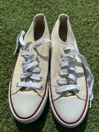 Zapatillas de lona en color beige y blanco. - Cierre con cordones blancos. - Suela de goma con detalle en color burdeos. - Punta reforzada.