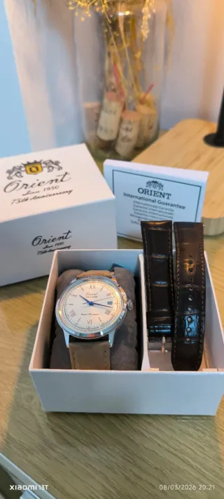 Precioso Orient Bambino Edición Especial 75 aniversario, es una edicion limitada. Viene con 2 correas intercambiables, una de ante y otra de piel. Movimiento automático "In-house" calibre F6724 (Hecho en Japón). Permite cuerda manual y tiene parada de segundero. Diámetro de la caja de 40,5 mm, tamaño clásico y muy versátil.Grosor de 12,3 mm. Cristal mineral abombado, que le da el aspecto vintage característico de la línea Bambino. Totalmente nuevo, sin uso. - Indicador de fecha. - Resistente al agua. Etiquetas:Orient, bambino, automatico, seiko, citizen, tsuyosa, lotus, festina, viceroy, regalo, padre, joya