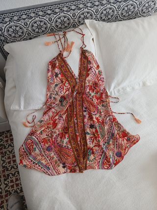 Vestido con un vibrante estampado étnico y detalles coloridos. Su diseño fluido lo hace ideal para cualquier ocasión. Utilizado en 2-3 ocasiones. - Estampado paisley y floral. - Escote pronunciado con cordones. - Espalda abierta - Detalle de borlas. - Corte holgado, caida fluida - Tejido delicado, seda y viscosa (70-30%)