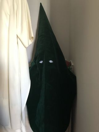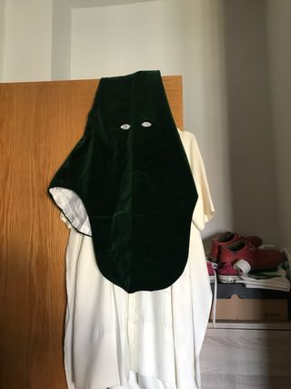 Traje de nazareno de la hermandad de La Soledad de San Lorenzo. - Diseño tradicional. - Capa con escudo. - Capucha con aberturas para los ojos. - Medidas de hombros 49 cms, de mangas 50 cms - Traje completo y cordón