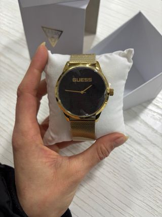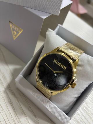 Elegante reloj Guess para hombre nuevo ,con un diseño moderno y sofisticado. - Esfera negra. - Correa de malla dorada. - Caja blanca