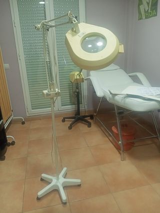 Lámpara lupa de precisión, ideal para tratamientos de belleza y estética. Su diseño permite una gran movilidad y ajuste. También se puede adaptar a una mesa. - Base estable con ruedas. - Brazo articulado para fácil posicionamiento. - Lente de aumento. - Iluminación integrada.