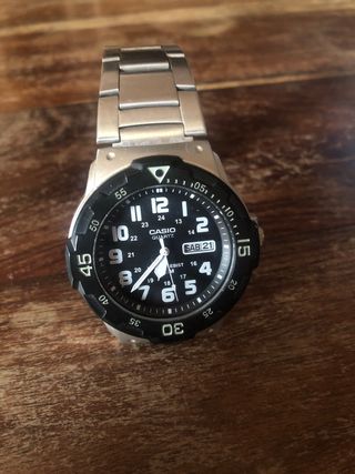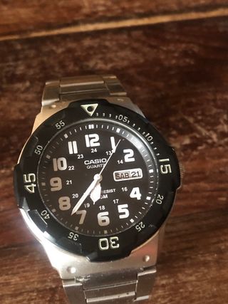 Reloj Casio modelo MRW-200H-1B2 con esfera negra y detalles plateados. - Correa de metal. - Bisel giratorio unidireccional. - Resistencia al agua 100M.