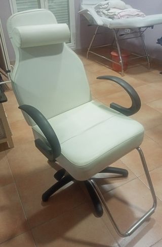Sillón de maquillaje con un diseño ergonómico y reposacabezas , y dos posiciones. - Base giratoria con reposaìes. - Brazos curvos. - Estructura metálica cromada.