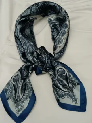 Elegante pañuelo de cuello con un bonito estampado paisley. - Diseño intrincado en tonos azules y grises. - Acabado satinado. - Tacto suave.