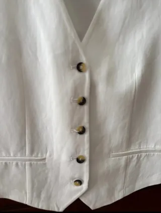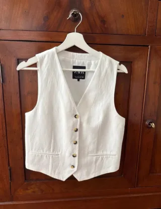 Chaleco de vestir de Zara en color blanco. Un básico elegante para cualquier ocasión. - Diseño de cuello V. - Cierre de botones. - Bolsillos delanteros.