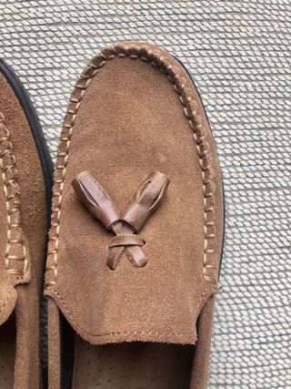 Mocasines de ante para caballero. Un calzado cómodo y elegante. - Diseño con antifaz y detalle de flecos. - Costuras decorativas. - Suela de goma.