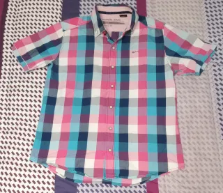 Camisa de manga corta con un llamativo estampado de cuadros. Talla M aunque da talla. - Diseño a cuadros en tonos azules, rosas y blancos. - Cuello camisero. - Cierre de botones. - Logo bordado en el pecho. Mucha más ropa en mi perfil.