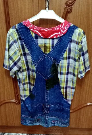 En la etiqueta pone XL pero equivale a una S, para chico u hombre delgado. Camiseta con estampado de traje de granjero. Diseño divertido y original. - Estampado de peto vaquero y camisa a cuadros. - Pañuelo rojo en el cuello. - Detalles de parches y herramientas. Mucha más ropa en mi perfil.