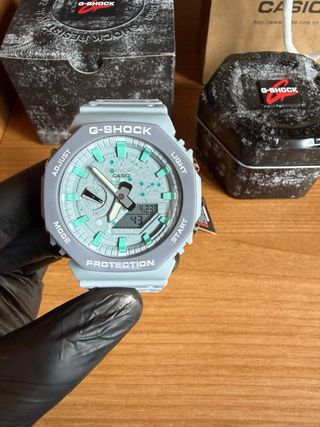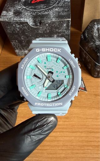 Reloj Casio G-Shock con un diseño moderno y llamativo. - Combinación de colores gris y turquesa. - Esfera con detalles salpicados. - Correa de resina resistente.