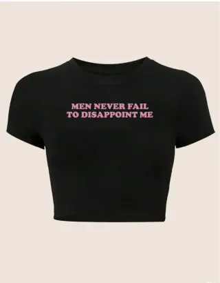 Top negro con un mensaje llamativo. - Diseño con texto MEN NEVER FAIL TO DISAPPOINT ME en rosa. - Corte moderno y favorecedor.