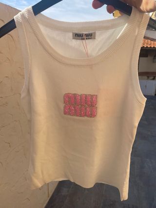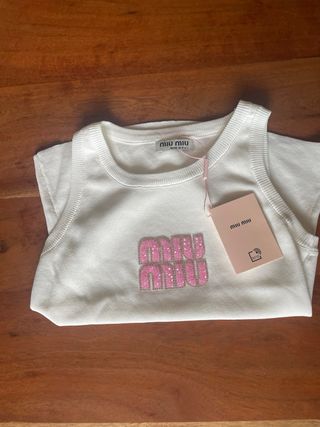 Top de Miu Miu en color blanco con un llamativo logo frontal. - Nuevo, sin usar ‼️ - Logo de Miu Miu con pedrería rosa. - Diseño sin mangas. - Cuello redondo.