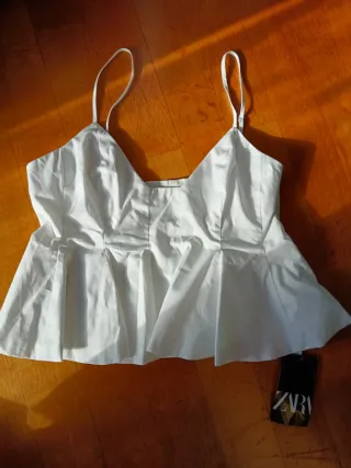 Top de Zara en color blanco, con tirantes finos y un diseño con vuelo. - Escote en V. - Detalle de pliegues en la parte inferior.