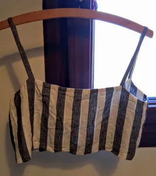 Top de tirantes con un diseño de rayas verticales en blanco y gris. Es un top corto y ligero, perfecto para el verano. - Diseño de rayas verticales. - Tirantes finos. - Corte crop.