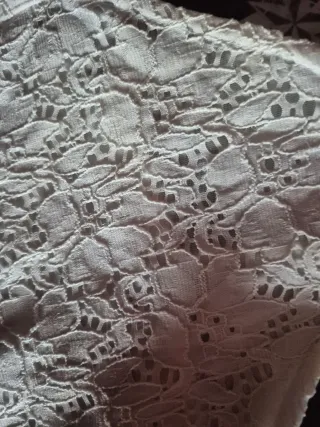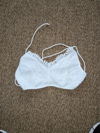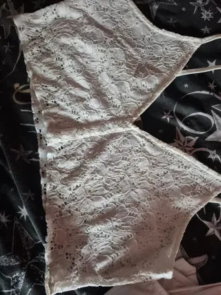 Top de encaje blanco con un diseño delicado y femenino. Ideal para añadir un toque especial a tu atuendo. - Tejido de encaje floral. - Tiras finas para atar.