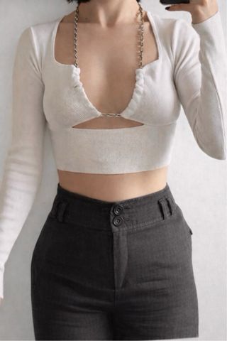 Top blanco de Bershka, estilo crop top con detalle de cadena plateada en el escote. Tiene manga larga, tejido elástico y un cut out frontal que queda muy favorecedor. Talla XS 32 cm de ancho (de axila a axila). 35 cm de largo. #bershka #topblanco #croptop #topcadena #y2k #topfiesta #toptrendy #ropamujer #topmangalarga #cutout #modaactual #zaraestilo #outfitnoche #toporiginal