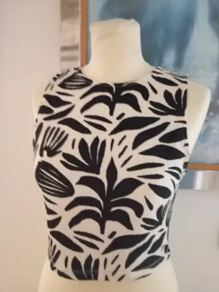 Top corto con un llamativo estampado de hojas en blanco y negro. Es una prenda versátil y moderna. - Diseño sin mangas. - Corte crop top.
