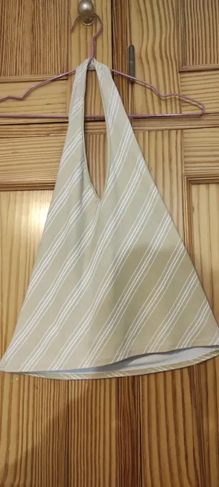 Top con escote halter y diseño de rayas verticales. - Diseño de rayas en beige y blanco. - Corte halter. - Talla M