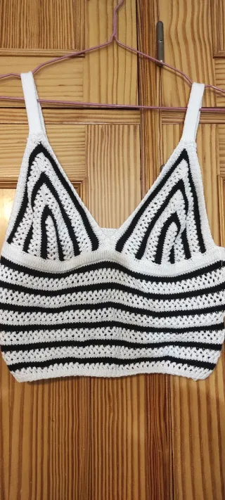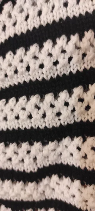 Precioso top de crochet con un diseño de rayas en blanco y negro. Es una pieza única y llamativa. - Tejido de crochet. - Diseño de rayas horizontales y en V en la parte superior. - Tirantes blancos.