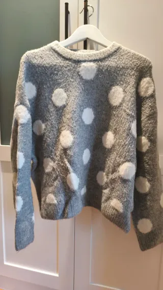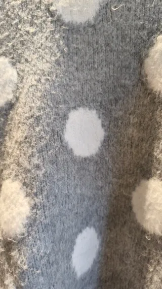 Jersey de punto con un diseño de topos. - Diseño de lunares blancos sobre fondo gris. - Tejido suave y cálido. Muy calentito