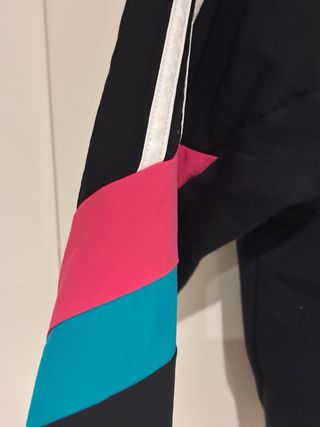 Sudadera corta de Adidas Originals con un diseño moderno y deportivo. - Mangas largas. - Cuello alto con cremallera. - Detalle de las tres rayas icónicas en blanco. - Paneles de color rosa y turquesa en las mangas.