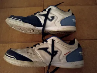 Botas de fútbol sala Joma Top Flex en color blanco y azul. Perfectas para jugar en pistas interiores. Piel. - Cierre con cordones. - Suela de goma. Con poco uso, en muy buen estado. Talla 40