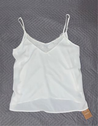 Este top lencero combina un diseño delicado con detalles de encaje. - Tejido principal blanco. - Panel frontal de encaje. - Tirantes finos ajustables. - Ribete de encaje en el escote y bajo.
