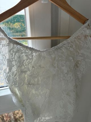 Precioso top blanco roto con detalles de encaje en el bajo. Es ligero y muy cómodo. Equivale Talla M 38 - Tirantes finos. - Cierre de botones en la parte delantera. - Bajo con detalle de encaje y flecos.