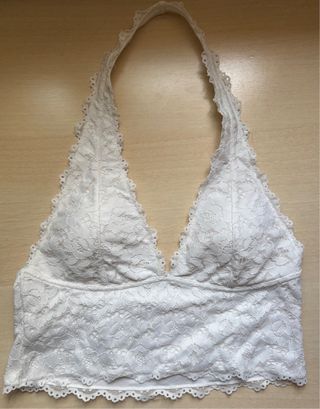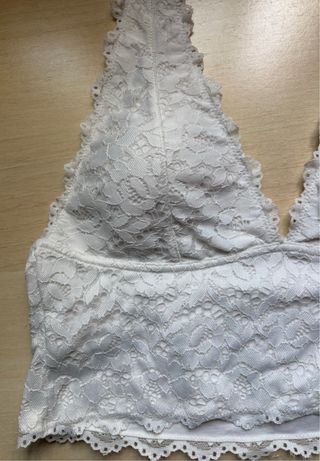 bralette de encaje en color blanco con refuerzo de copas de sujetador es completamente elástico y tiene tirantes ajustables cruzados en la espalda marca talla XL pero es talla L