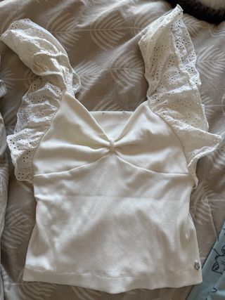 Top de encaje blanco de Bershka. - Diseño delicado con volantes. - Pequeño lazo central.