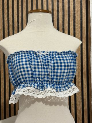 Top corto con un diseño de cuadros vichy en azul y blanco. Presenta un detalle de volantes en el borde superior y un delicado encaje en el bajo. - Estampado de cuadros. - Volantes. - Detalle de encaje.