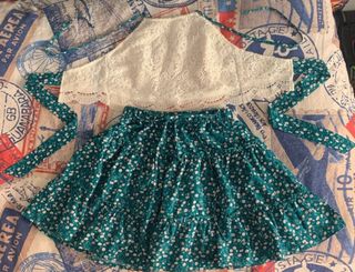 Conjunto de dos piezas de Shein, ideal para un look fresco y femenino. - Top blanco de encaje con tiras. - Falda corta verde con estampado floral blanco y volantes. NO se hacen envíos.