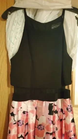 Elegante vestido largo de fiesta con estampado floral. - Cuerpo superior negro. - Falda larga con flores en tonos rosa y negro. - Diseño de tirantes. Vestido largo de fiesta de la boutique Camille La Vie, talla M, comprado en EEUU. Una sola pieza compuesta de tope negro de tirantes y falda floreada con tonos rosados. Ambas partes se unen por una delicada malla negra (se aprecia en la 2da foto). Tiene forro como se aprecia en la última foto. En perfecto estado por fuera. El forro blanco por dentro tiene alguna manchita que no se pudo quitar pero no se ve. Precio original de compra: 170 euros