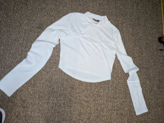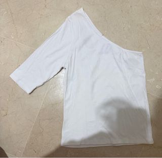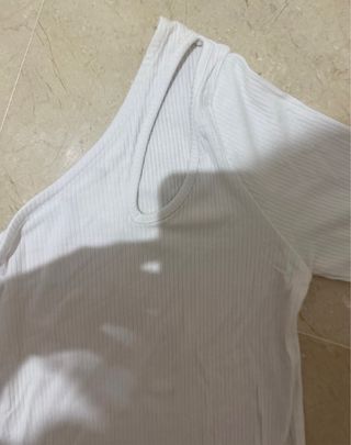 Top blanco con un diseño moderno de una sola manga. - Corte ajustado. - Manga larga en un lado. - Escote asimétrico. Usado pocas veces
