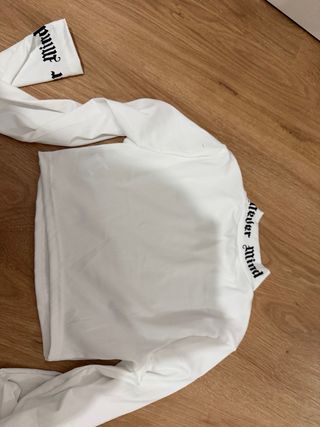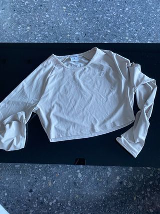 Top blanco de manga larga con un detalle de cadena en la parte inferior. - Diseño crop top. - Manga larga. - Detalle de cadena metálica. Es talla XS. Tiene poco uso, está en perfecto estado.