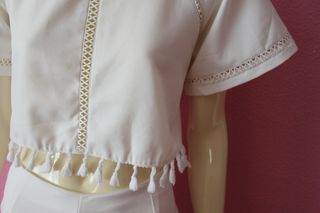 Conjunto de top corto y short con detalles bordados. Marca Talla: L , para una 36/38 - Top con mangas cortas y escote en V. - Short de talle alto. - Adornos de flecos en el bajo del top. - Diseño con puntillas y costuras decorativas.