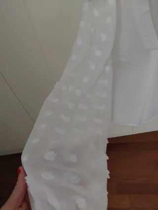 Elegante blusa blanca con un diseño delicado y femenino. Perfecta para añadir un toque sofisticado a tu armario. - Mangas largas transparentes con detalle de topos. - Cuello en V. - Tejido ligero y vaporoso.