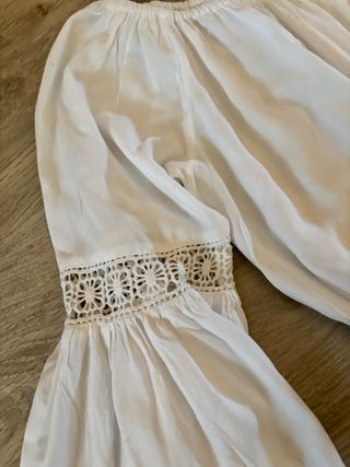 Top sin mangas de encaje tipo guipur de Zara Woman Collection. Color beige claro/blanco roto. Es una prenda calada (transparente). Cuello redondo con acabado fino y bajo con acabado en ondas naturales del encaje. Medidas: 51 cm largo 102 cm ancho 45 cm axila a axila