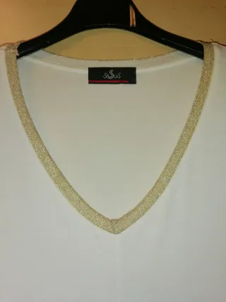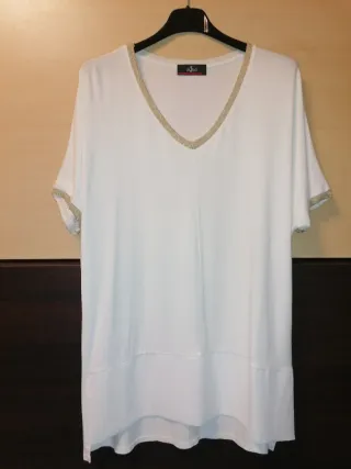 Elegante top blanco con detalles dorado brillante en el escote y las mangas. - Escote en pico con brillo dorado. - Mangas cortas con borde adornado. - Diseño de corte recto y aberturas a los lados.